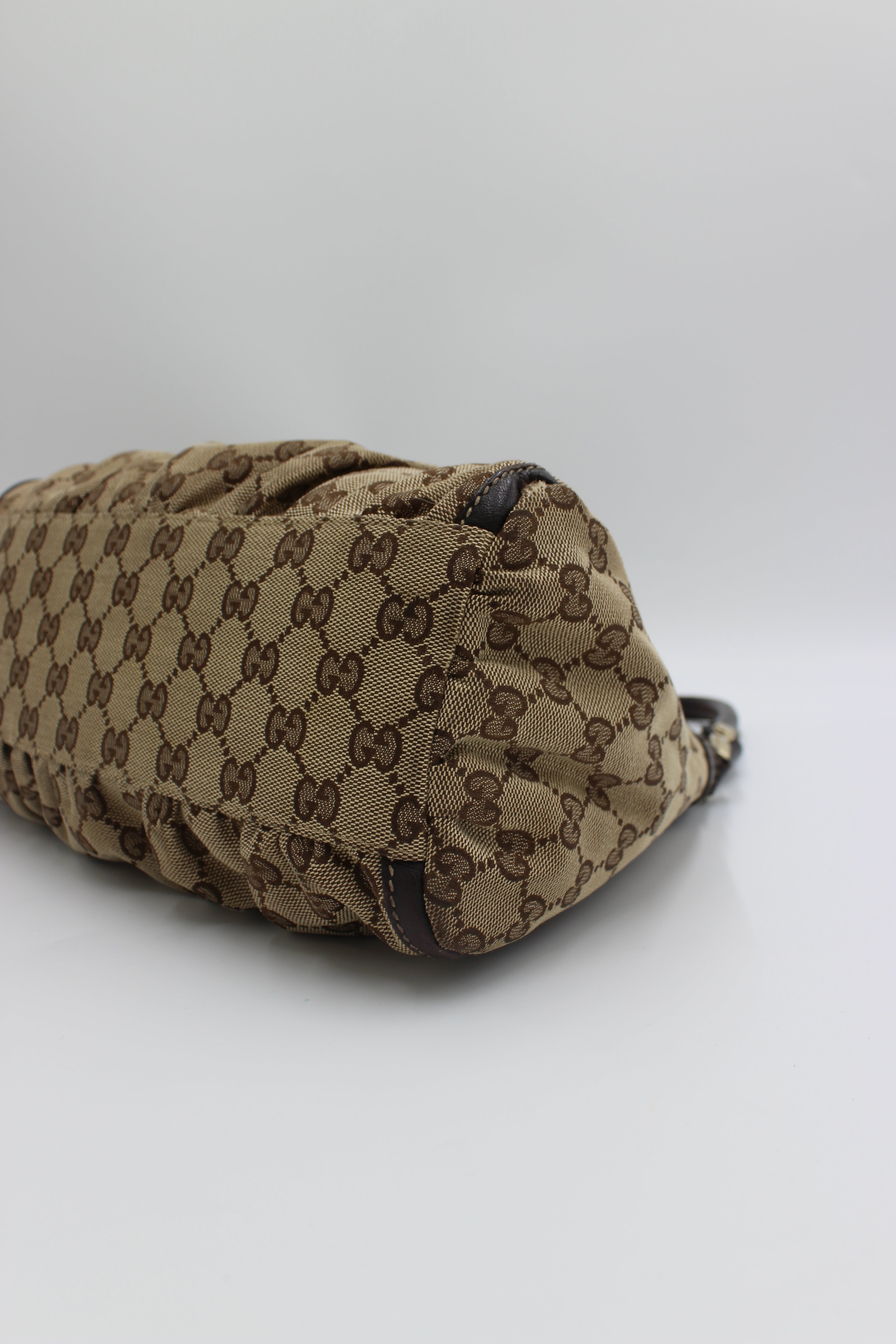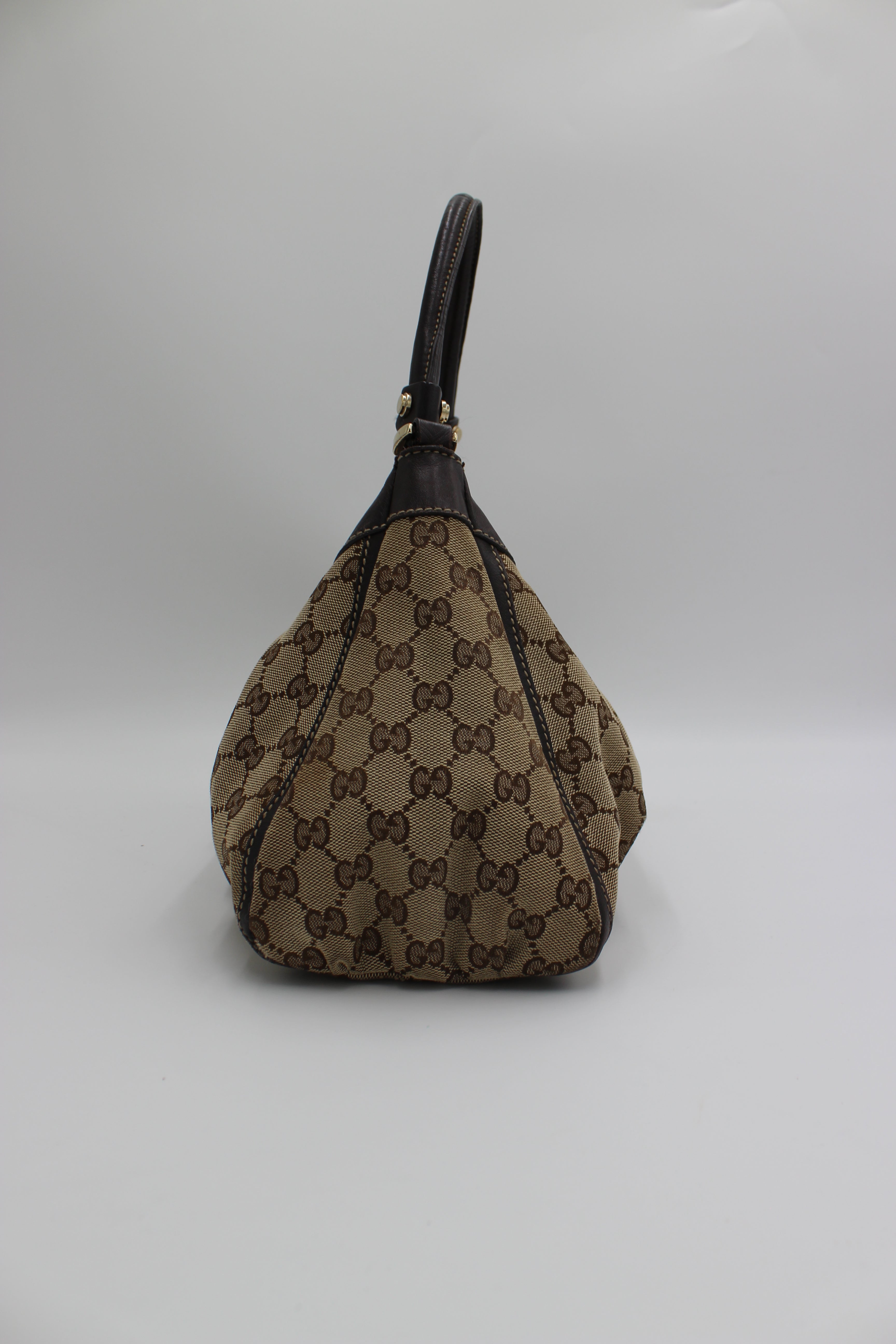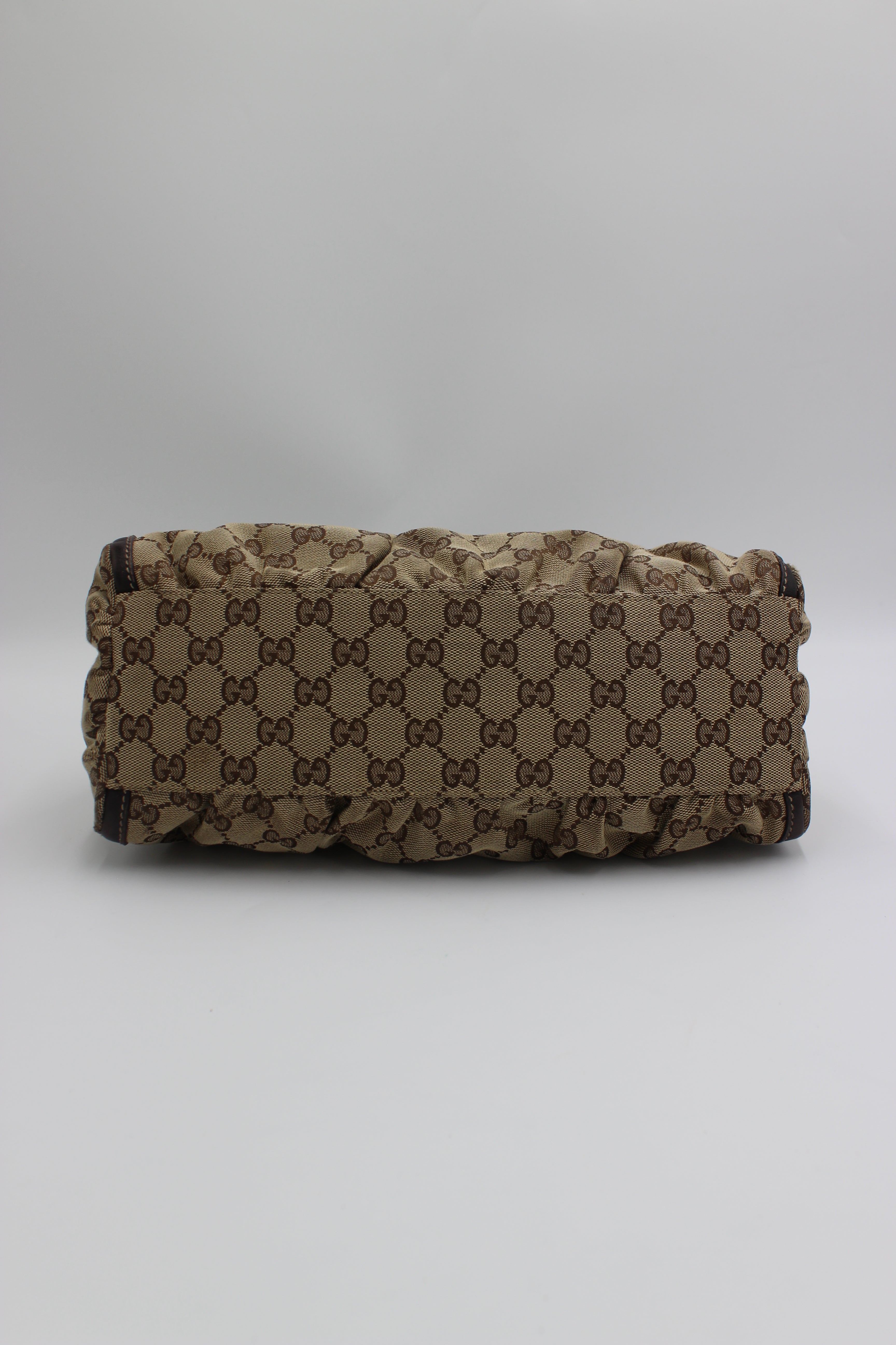 Tasken er fremstillet i Guccis ikoniske beige og brune GG-monogram canvas, som er smukt indrammet af mørkebrunt læder på både kant, bund og hank. Designet fuldendes af den karakteristiske gyldne D-ring på fronten med indgraveret Gucci-logo, samt den elegante rynke-effekt (pleats), der giver tasken et blødt og feminint fald.
