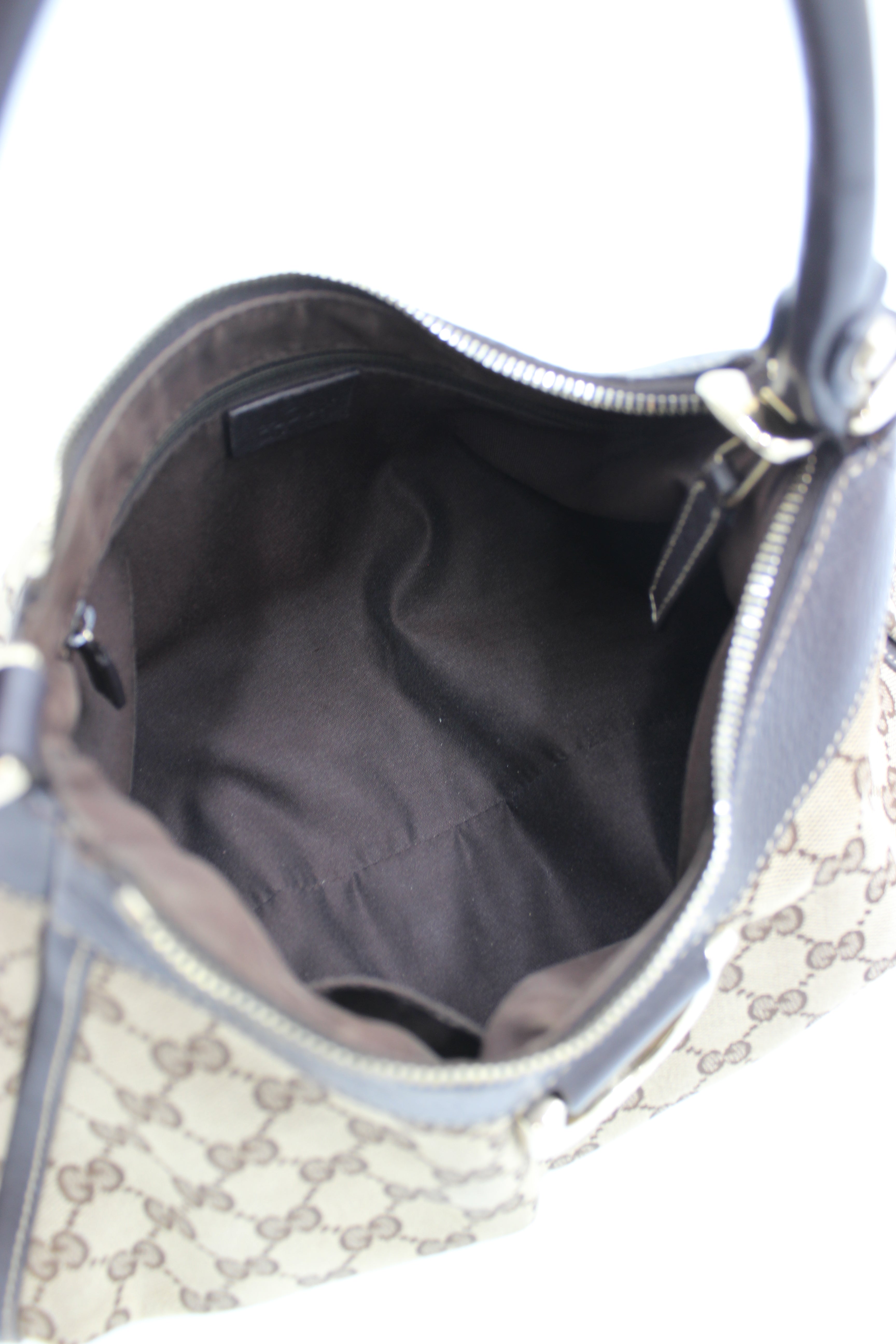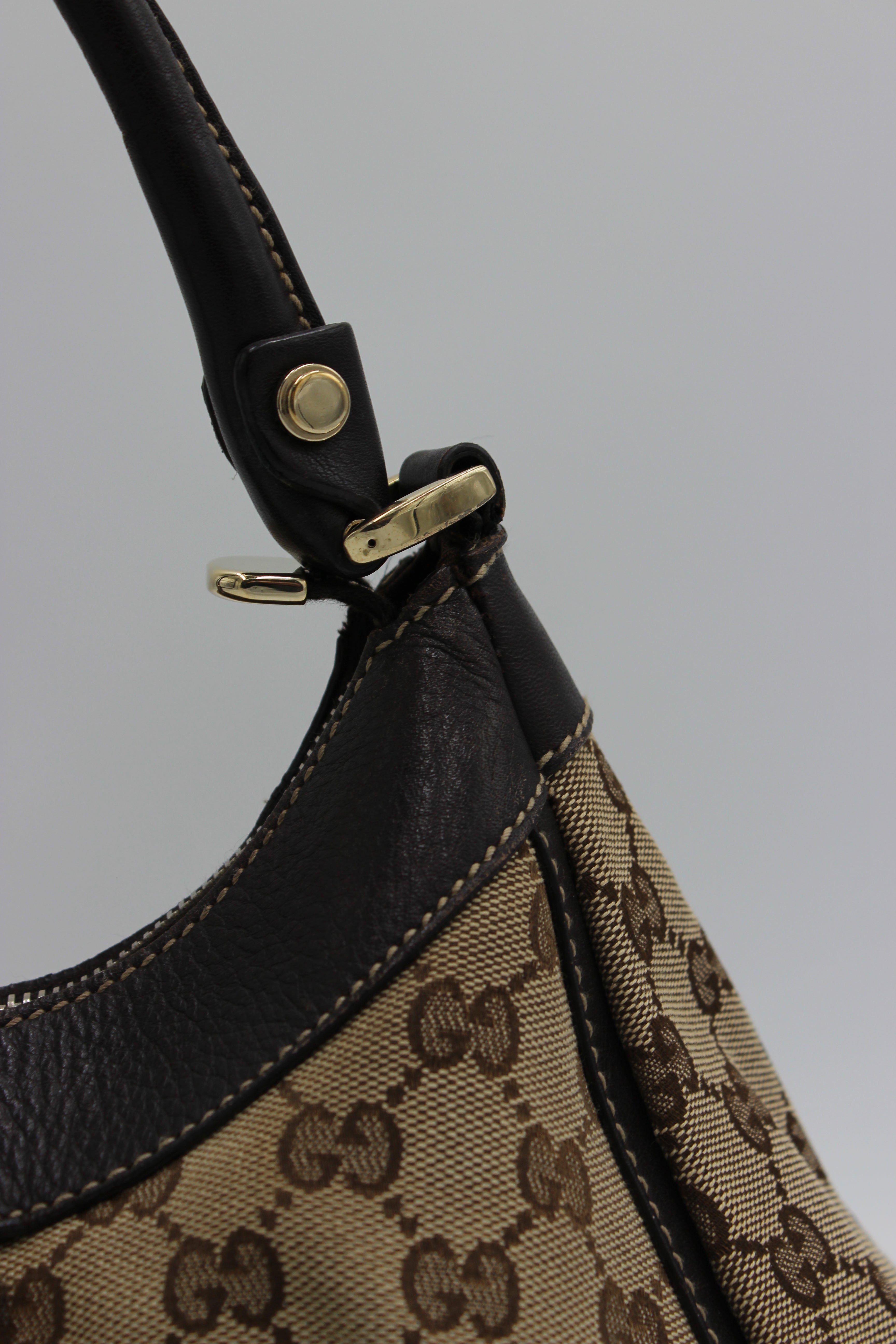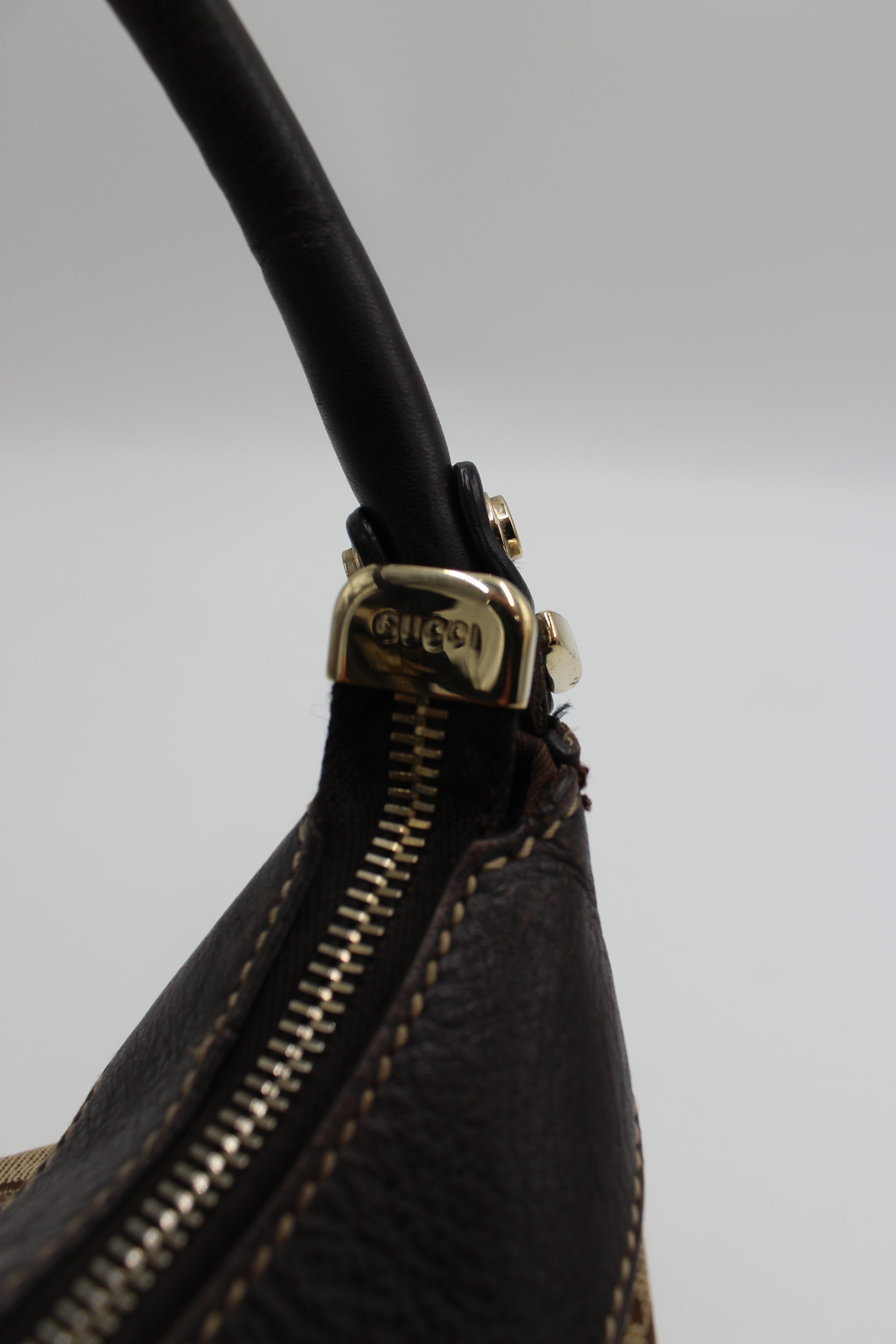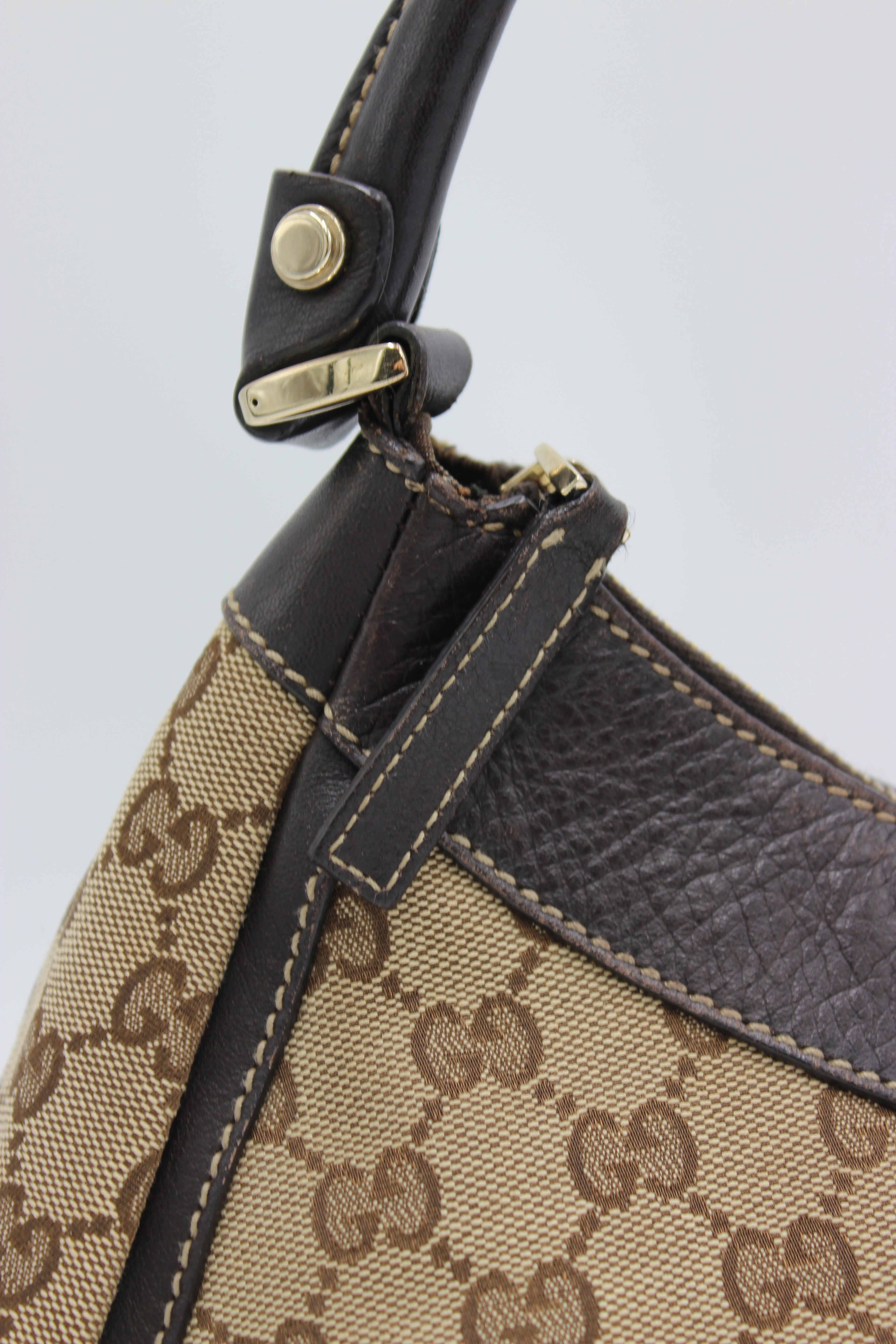 Tasken er fremstillet i Guccis ikoniske beige og brune GG-monogram canvas, som er smukt indrammet af mørkebrunt læder på både kant, bund og hank. Designet fuldendes af den karakteristiske gyldne D-ring på fronten med indgraveret Gucci-logo, samt den elegante rynke-effekt (pleats), der giver tasken et blødt og feminint fald.